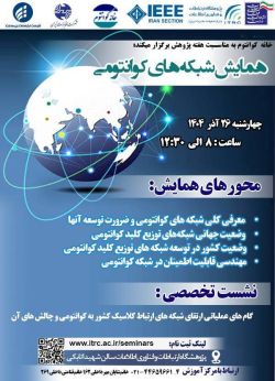 همایش *شبکه های کوانتومی*  ( حضوری و مجازی ) *زمان:* چهارشنبه 26 آذر ماه ساعت  8 الی 12:30 *مکان:* پژوهشگاه ارتباطات و فناوری اطلاعات- طبقه  دوم-  سالن شهید اتابکی